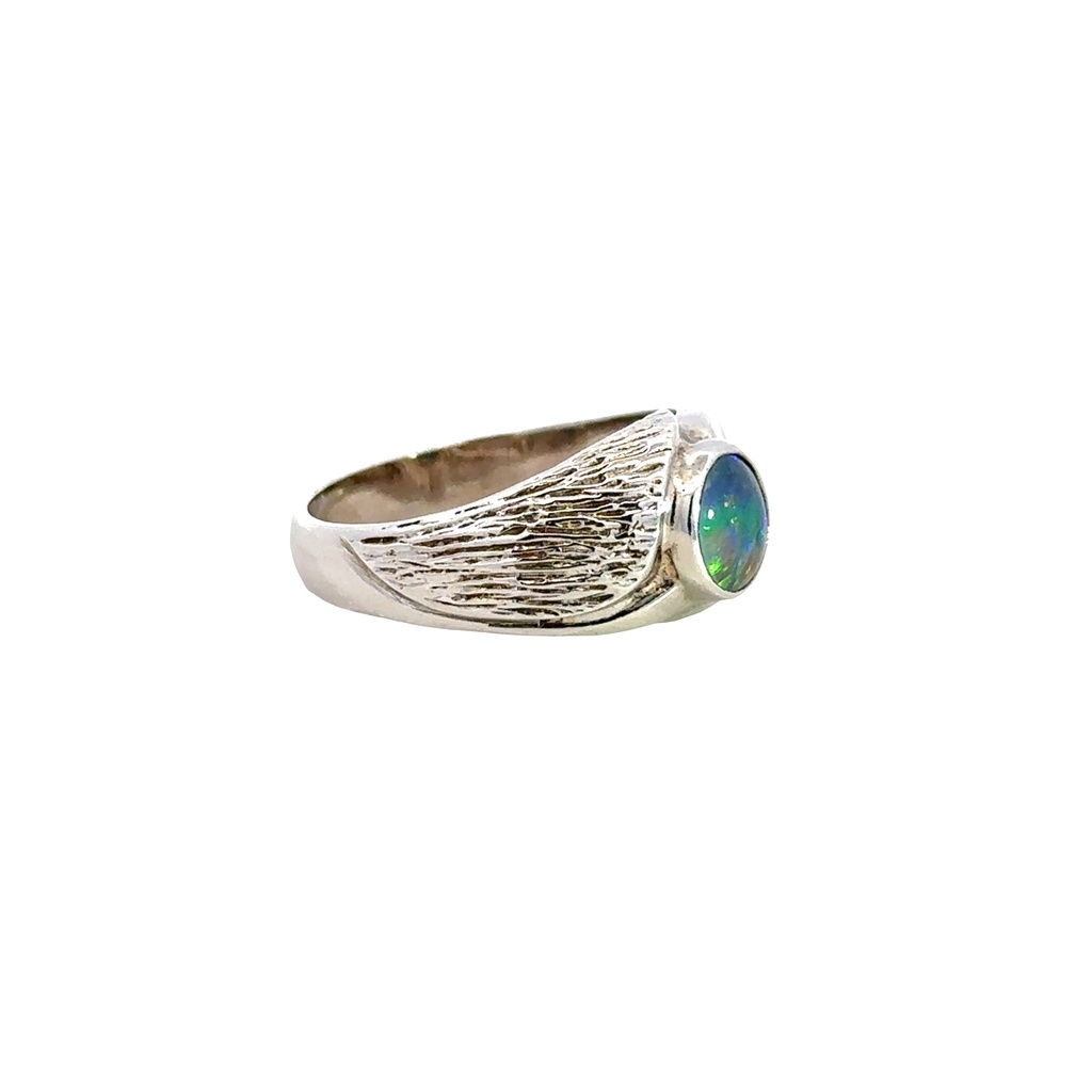 This beautifully understated sterling silver ring features a 6.4mm circular triplet opal, set securely within a sleek bezel setting. The opal displays a mesmerising play-of-colour—swirls of electric green, deep blue, and soft flashes of crimson dance across its surface, catching the light from every angle.